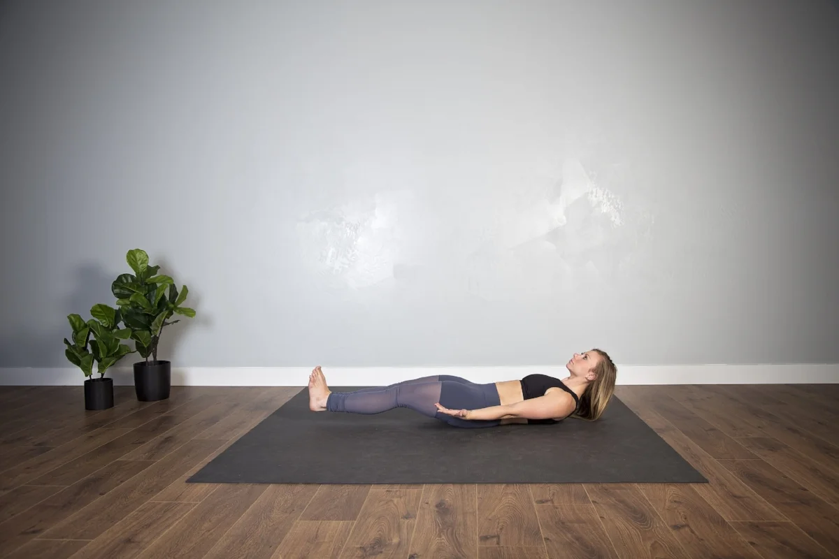 This one is often called a hollow hold. Pause when your heels and shoulders are slightly hovering above the mat.