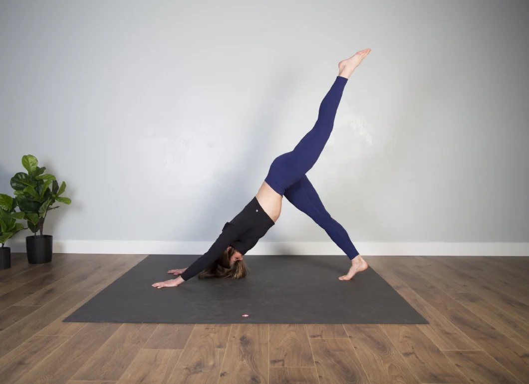 Starting in downward dog, lift one leg up. Straighten through the leg as much as possible, and keep the lifted hip (left hip, in this photo) rotated down so that it is in line with the right.