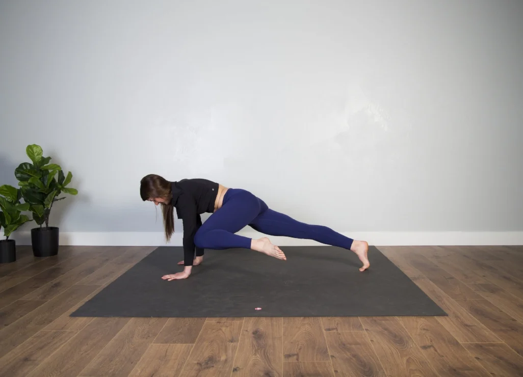 You may be just learning this pose, or you could be a pro. Wherever your progression is in this pose, note that it is a really good prep for handstand strength. If you do have the balance in the pose work to tighten it up by straightening through the arms and lifting through the back of the heart. (Crow with straight arms is often referred to as Crane pose, actually.)