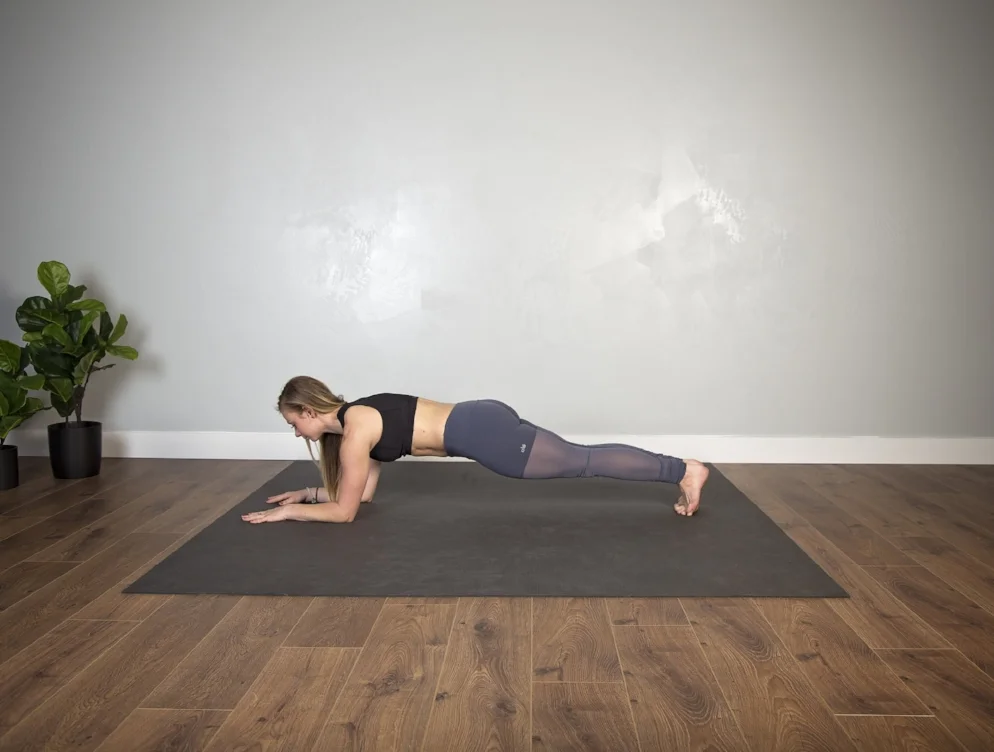 From a high plank, or top a pushup position, rock your weight forward into your fingertips. Lower down halfway, so that your elbows are stacked on top of the wrists and the arms bend at a 90 degree angle. You might pause here, and hold. Then lift and lower with your breath. Inhale to press up, exhale to lower. Don’t be afraid to slow the movement down in order to connect it to your breath!